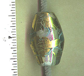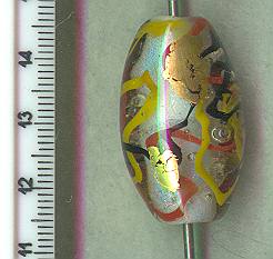 ![]() CALPYSO 3 BIG OVAL FOCAL OR PENDANT Calypso 3 had a beautiful but subtle dichro internal shimmer,that is a lot like an opal. Black, red and yellow party ribbons encased in clear - with 23 k gold leaf highlights. Bead is 1.25 inches long ! (32 cm) |