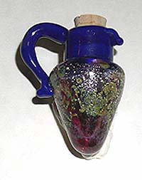Blown vessels - generally approximately 1.5 inches tall. Great fun for small pendant, perfume, essential oil, etc. Each comes with a natural cork, even if not pictured. Some bottles have handles - some do not. The ones without a handle are easily wire-wrapped in silver or gold to create a pendant. |